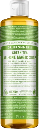 Naturalne mydło w płynie 18 w 1 zawiera kompozycję organicznych olejków: kokosowego, oliwkowego, z ziaren palmowych, konopnego i jojoba i zostało uszlachetnione naturalnym aromatem zielonej herbaty. Mydło Dr. Bronner's to najczystsze składniki organiczne z certyfikowanych upraw ekologicznych i z certyfikatem Sprawiedliwego Handlu. Wegańskie, biodegradowalne, bezpieczne dla ludzi, zwierząt i środowiska. Opakowanie pochodzi w 100% z recyklingu pokonsumenckiego PCR. 18 w 1 oznacza wszechstronne zastosowanie. Nasze mydła 18 w 1 są potrójnie skoncentrowane, wystarczy kilka kropel!